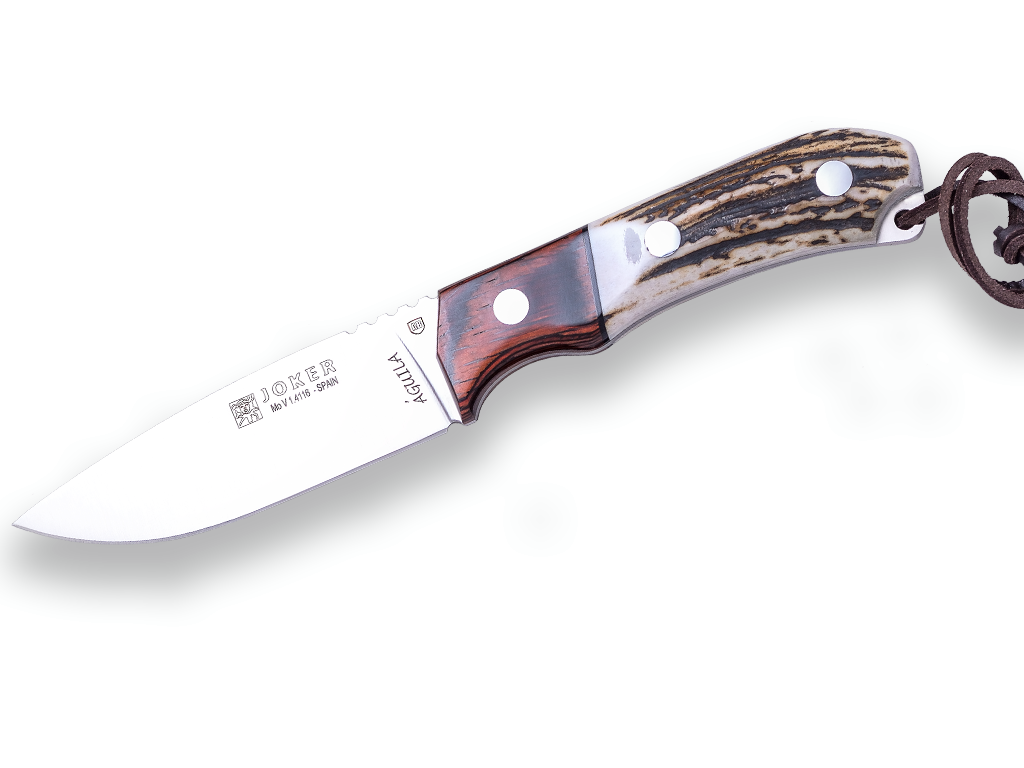 Ovo je idealan lovački nož malih dimenzija. Dužina sečiva je 10,5 cm, a težina celog noža iznosi 230 grama. Samo sečivo je izrađeno od nerđajućeg čelika to jest od Molybdenun Vanadiuma. Izdržljiv i kompaktan Lovački nož nerđajući Joker Aguila CC105 odličan je za sve lovce koji su u potrazi za vrhunskom opremom malih veličina. Drška je od prirodnih sirovina napravljena, tačnije od jelenskog roga. Rog je posebnom impregnacijom tretiran tako da bude dodatno otporan na vlagu. Baš zbog ove komponente nož izgleda retro, a samo sečivo je izrađeno sa kvalitetnim sirovinama i modernom tehnikom.