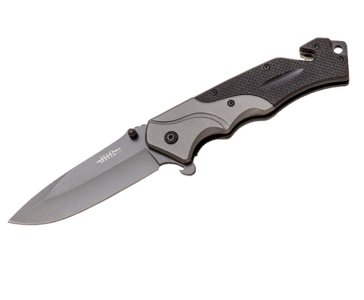 Nož za prezivljavanje Joker PRO sa drškom G10, sečivom za sečenje kaiša i razbijačem stakla, sečivom od nerđajućeg čelika dužine 9,5 cm sa titanijumskim premazom i prstenom od nerđajućeg čelika.