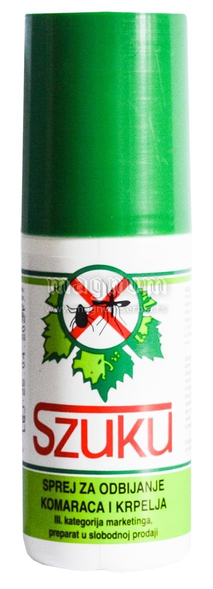 Szuku sprej efikasno stiti od ujeda komaraca i krpelja. Ravnomerno nanešen na kožu pruža zaštitu 5-7 sati. Pre upotrebe promućkati i naneti na sve nepokrivene delove tela. Postupak ponoviti po potrebi ako dejstvo prodje. Ne koristiti na osetljivoj ili na koži na kojoj ima povreda. Rok upotrebe je dve godine od datuma proizvodnje. Količina 50ml.